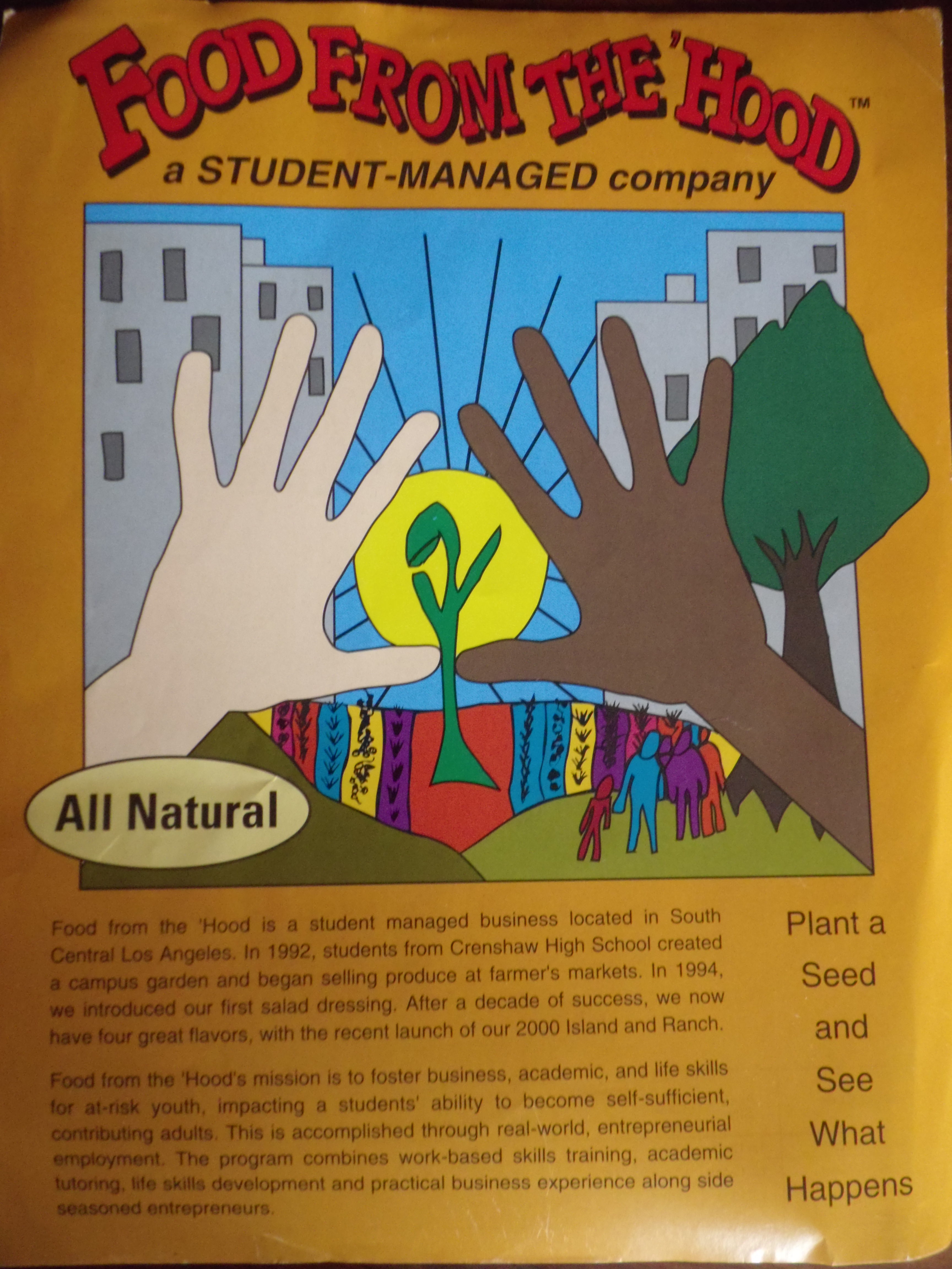 Food From the Hood was a student-run business created by students at Crenshaw High School in the wake of the L.A. Uprising. The students grew and sold vegetables, then created salad dressing. Through the years, students throughout the Los Angeles area benefited from the program. They used the skills they learned from the program to persevere in the job market in their adult lives.